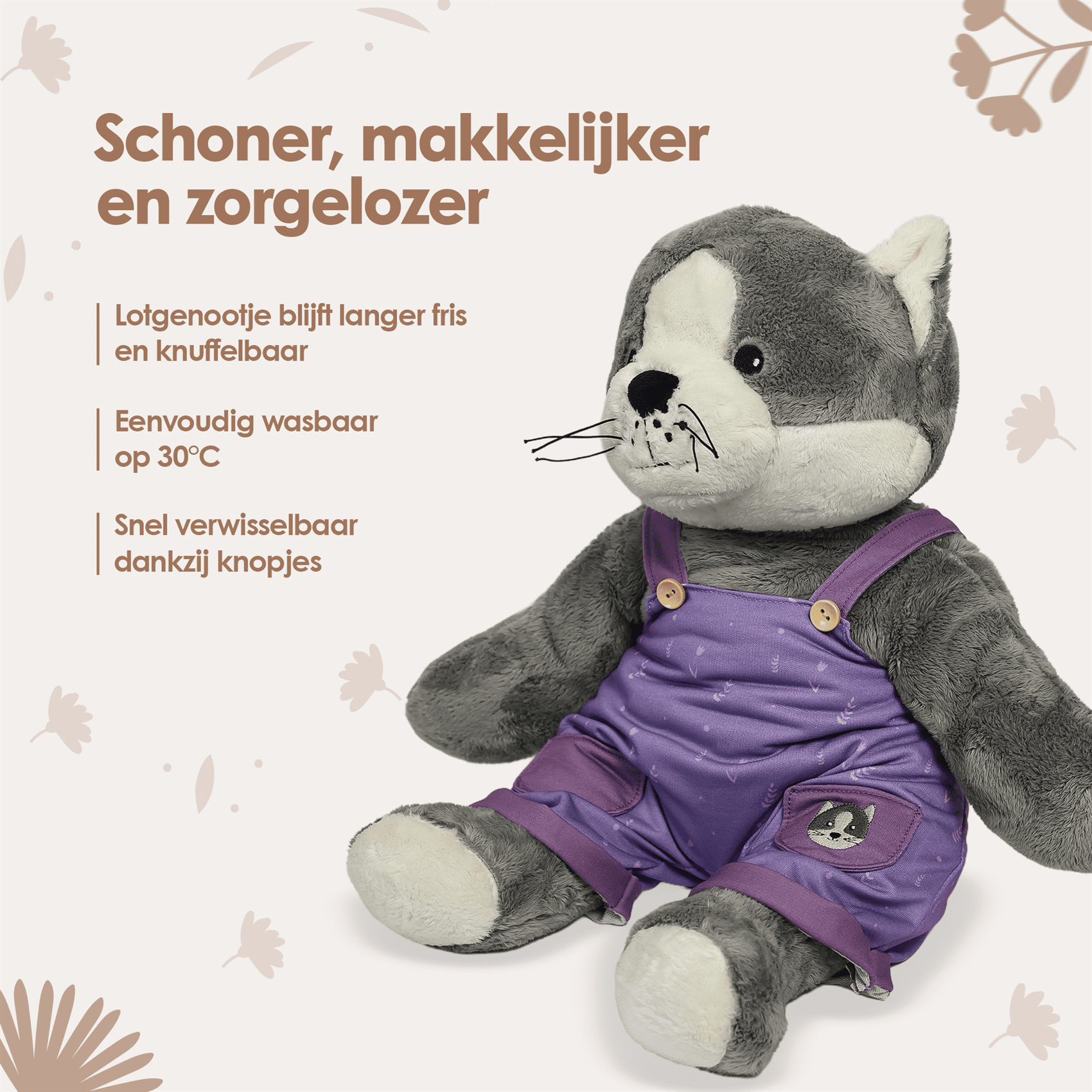 Onze Lotgenootjes worden intens gebruikt. In bed, op school, onderweg of in de zorg. Omdat ze niet in de wasmachine kunnen, is hygiëne belangrijk. De kleding beschermt je Lotgenootje tegen vuil, vlekken en slijtage, en is makkelijk wasbaar op 30°C.
